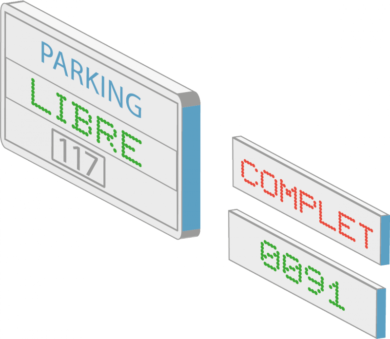 Dotés de LEDS bicolores haute performance (rouges, vertes et orange), ils garantissent une visibilité parfaite et une lecture immédiate des informations cruciales : nom du parking, disponibilité des places (Libre/Complet) et comptage précis en temps réel.